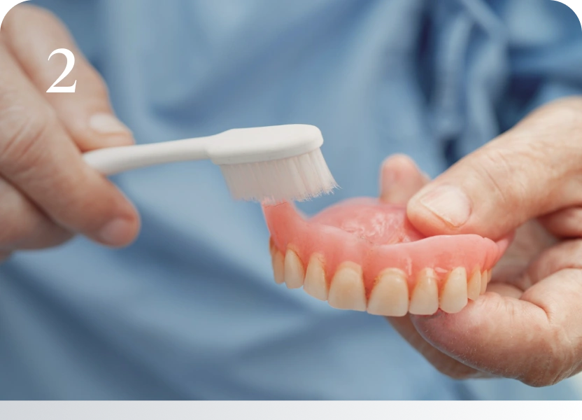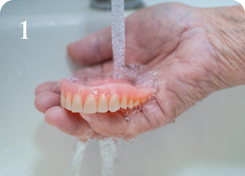 After every meal, rinse your dentures thoroughly to remove food particles and keep them feeling fresh and clean.